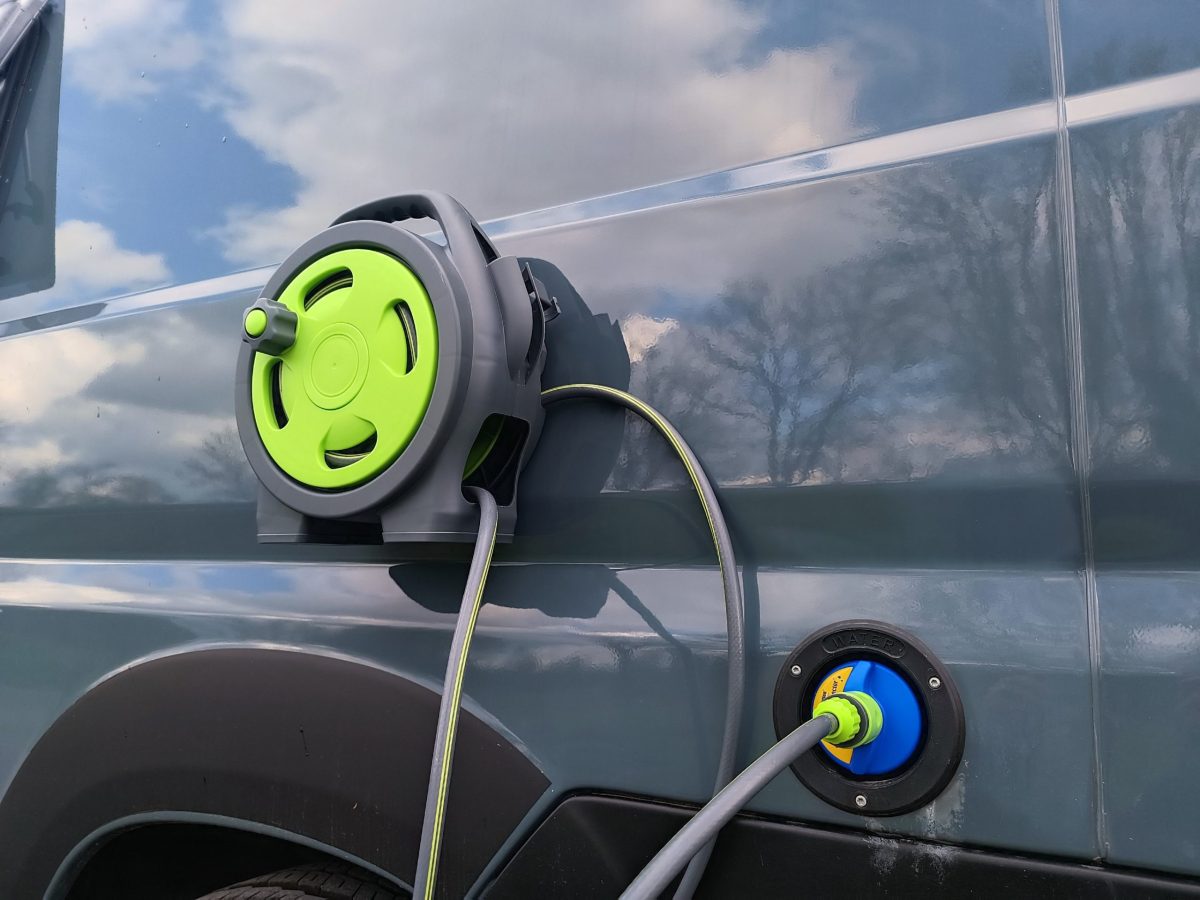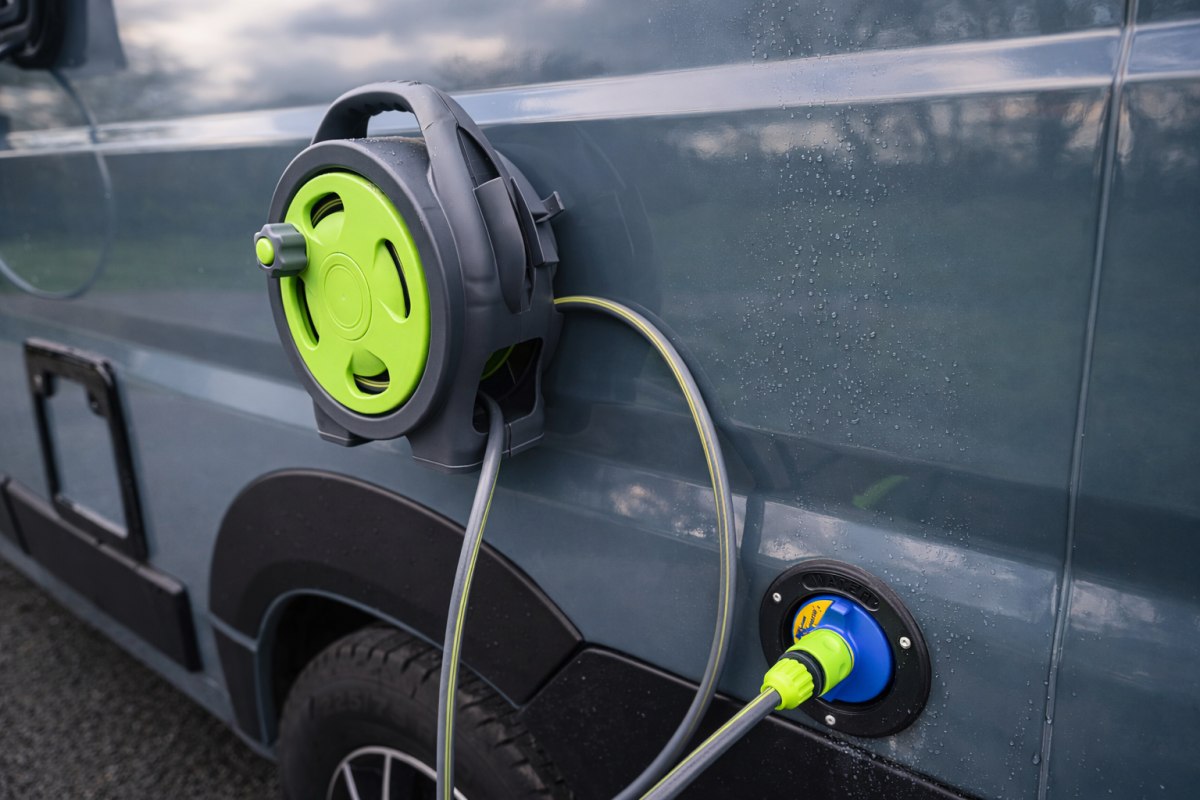 Le tuyau de 10 mètres offre une grande liberté de mouvement autour du fourgon. Vous atteignez facilement votre espace cuisine, vos vélos ou votre matériel de camping. Vous rincez vos chaussures, votre planche de surf ou votre chien après une sortie nature.